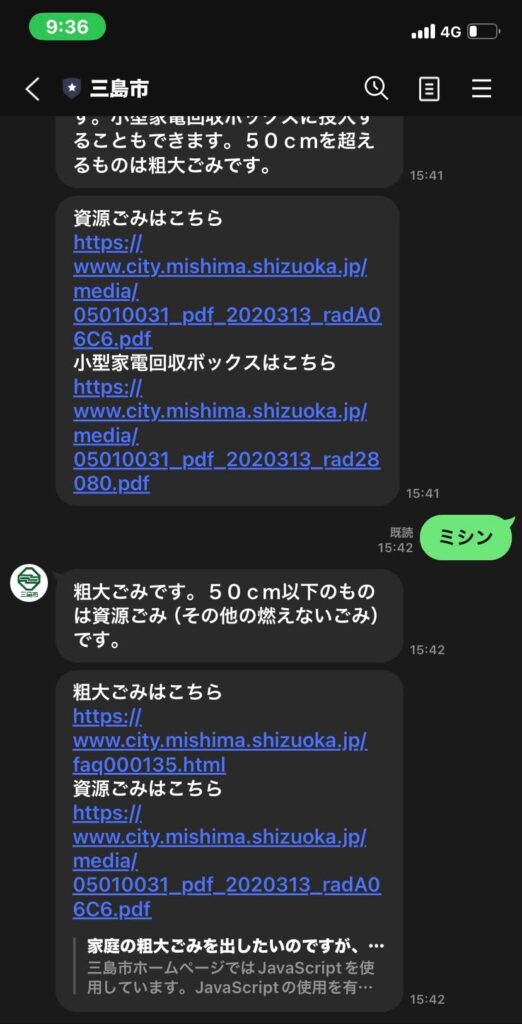 三島市では、このように公式LINEで処分したい品がどのゴミに分類されるか調べることができます。